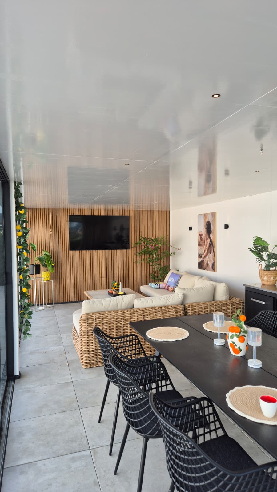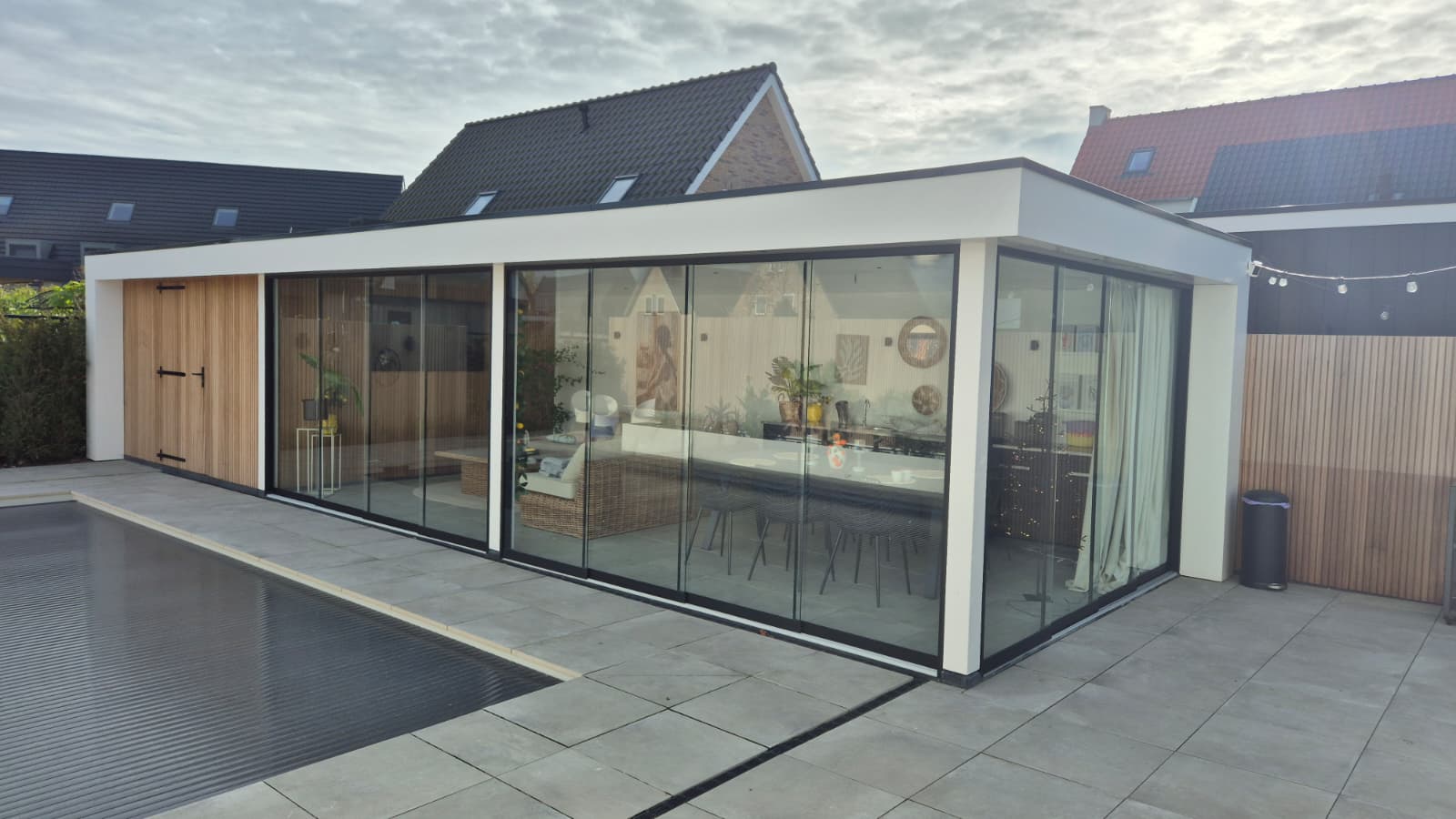 De frisse, witte look past bij elke tuin en zorgt voor een moderne uitstraling. De glazen schuifwanden maken de ruimte lekker licht en open. In de zomer schijf je ze makkelijk open, in de winter houd je ze dicht voor een knusse, beschutte plek. De ingebouwde opbergruimte biedt plek voor je spullen. Zo blijft je terras netjes én stijlvol!