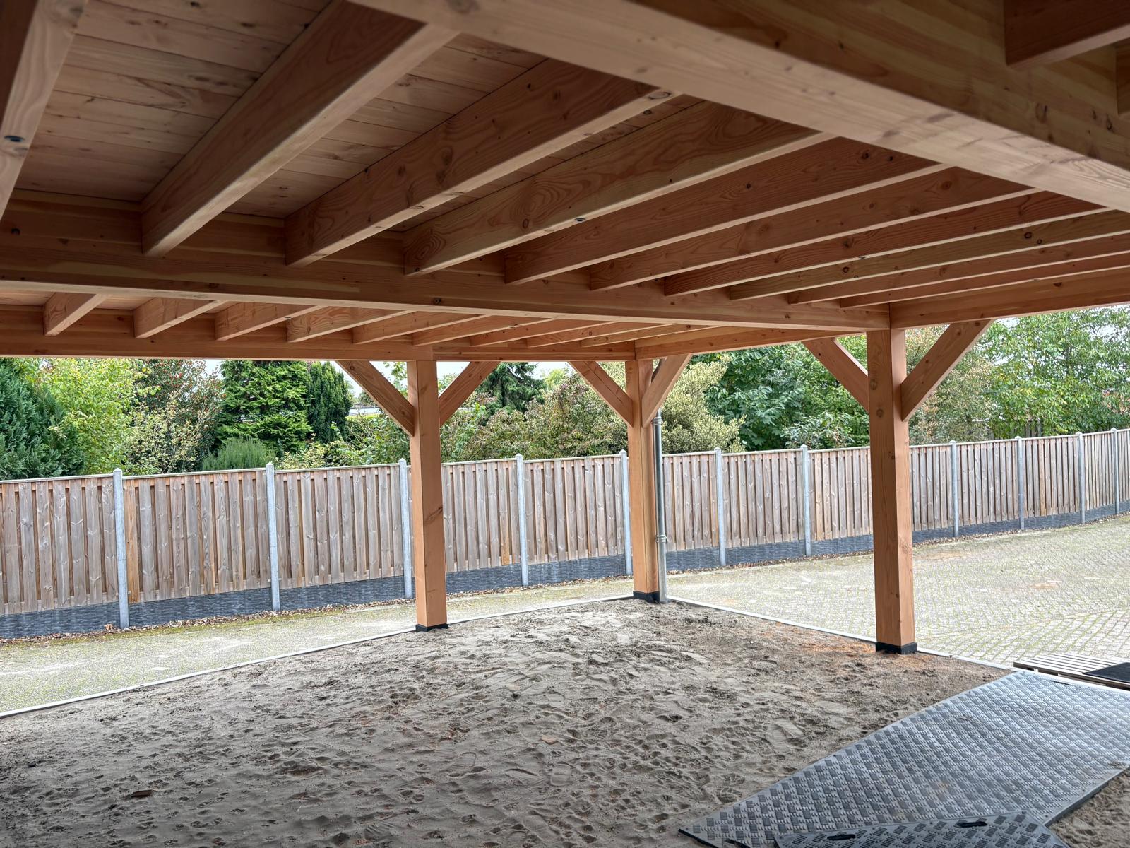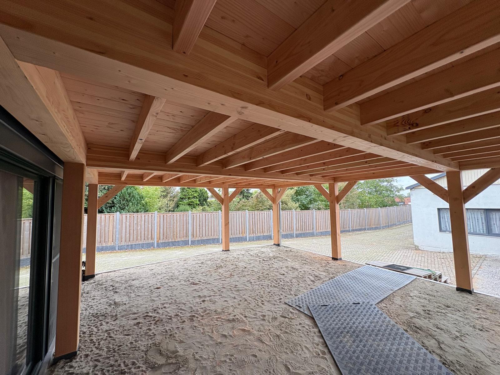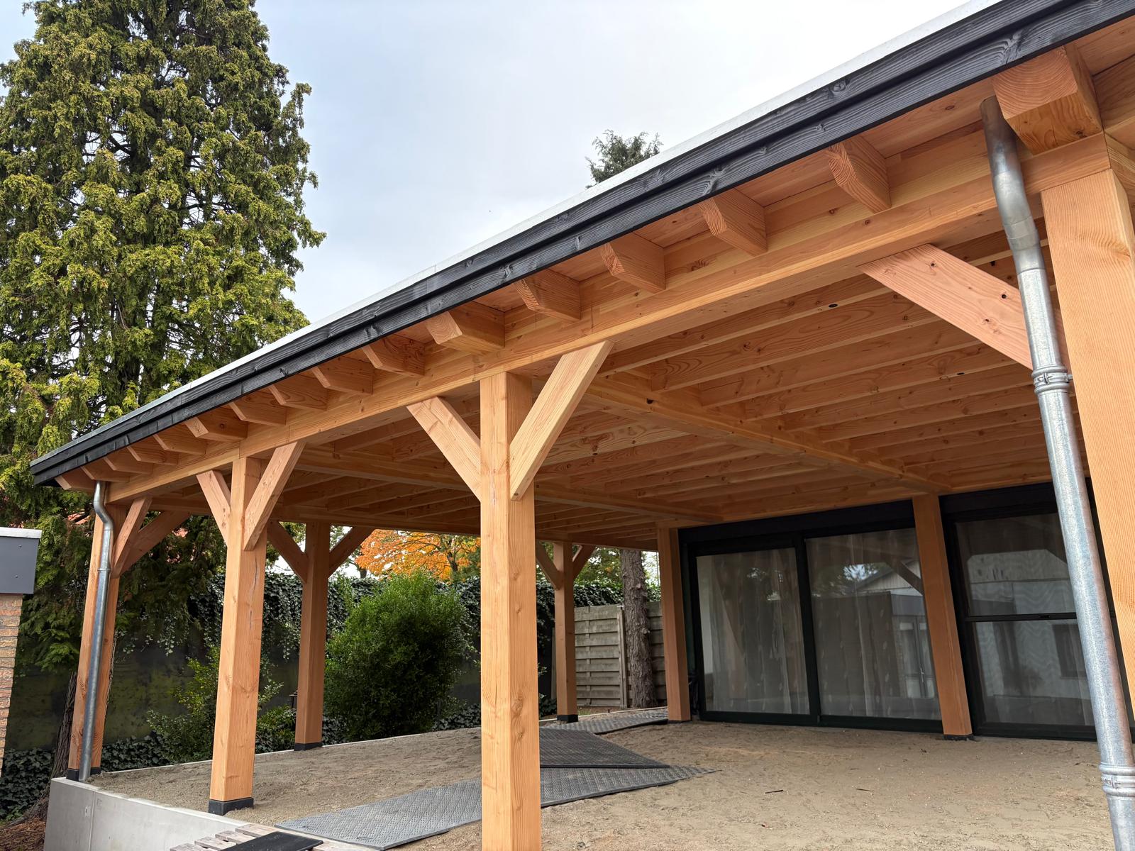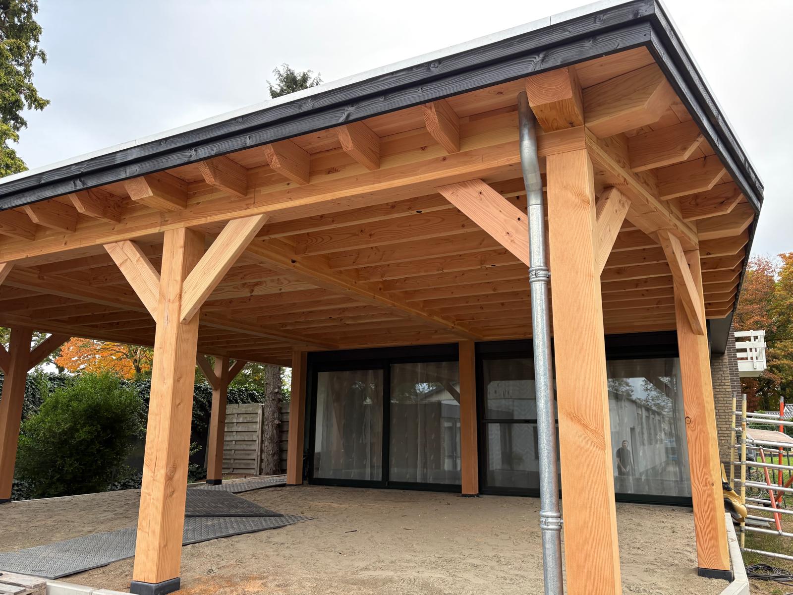 Voor onze klant in Bossenhoofd hebben wij deze gave robuuste overkapping mogen realiseren. Door het gebruik van Douglas hout gaat deze overkapping jarenlang mee en heeft deze ook nog eens een stoere uitstraling. Door de grootte van 54 m2 heb je hier meer dan voldoende ruimte om al je gewenste tuinmaterialen kwijt te kunnen en heerlijk te genieten van je buitenverblijf.