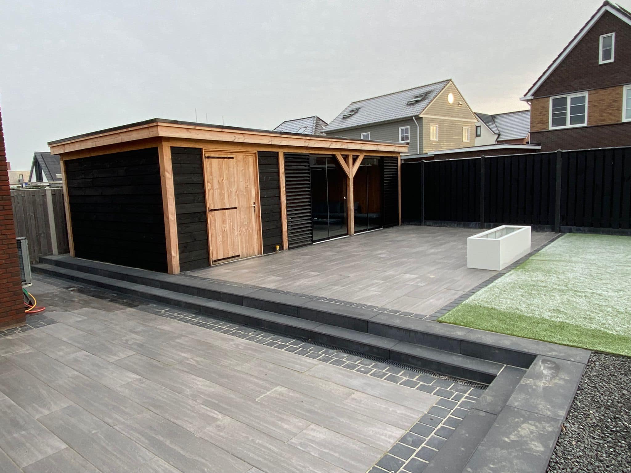 In deze tuin in Goes hebben wij ons kunne uitleven met als resultaat een geïsoleerde berging met overkapping van Douglas hout. Om het hele jaar door te kunnen genieten van deze mooie buitenruimte, hebben wij de overkapping voorzien van glazen schuifwanden. Aansluitend aan de overkapping hebben we een praktisch schuurtje geplaatst, dat dienst doet als opbergruimte voor tuingereedschap, fietsen en andere spullen. Zo blijft de tuin opgeruimd én is alles snel bij de hand.