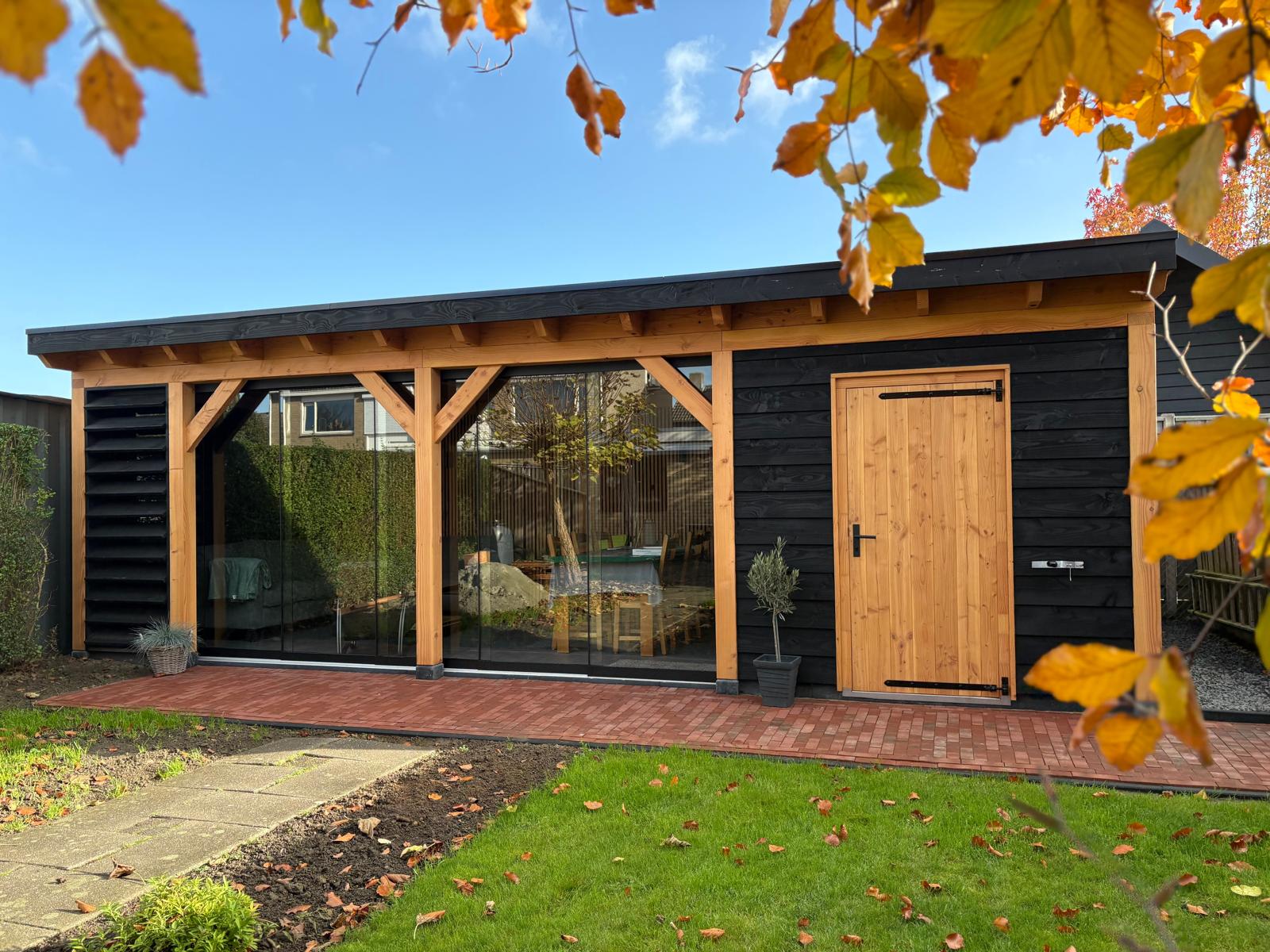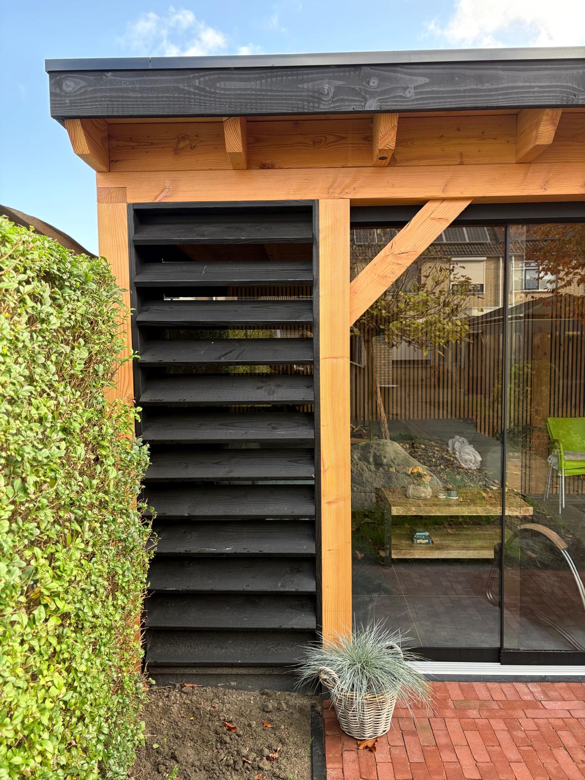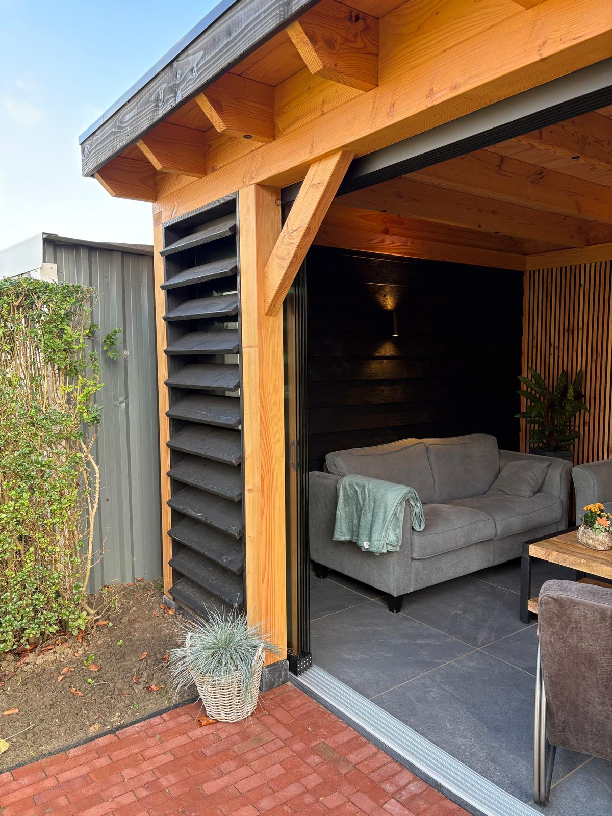 De overkapping heeft een praktisch schuurtje dat er aan vast zit, wat het geheel nog functioneler maakt. Ook hebben we een glaswand gemonteerd waardoor de wrmte beter in de overkapping blijft en je dus ehet hele jaar door van je tuinkamer kunt genieten.